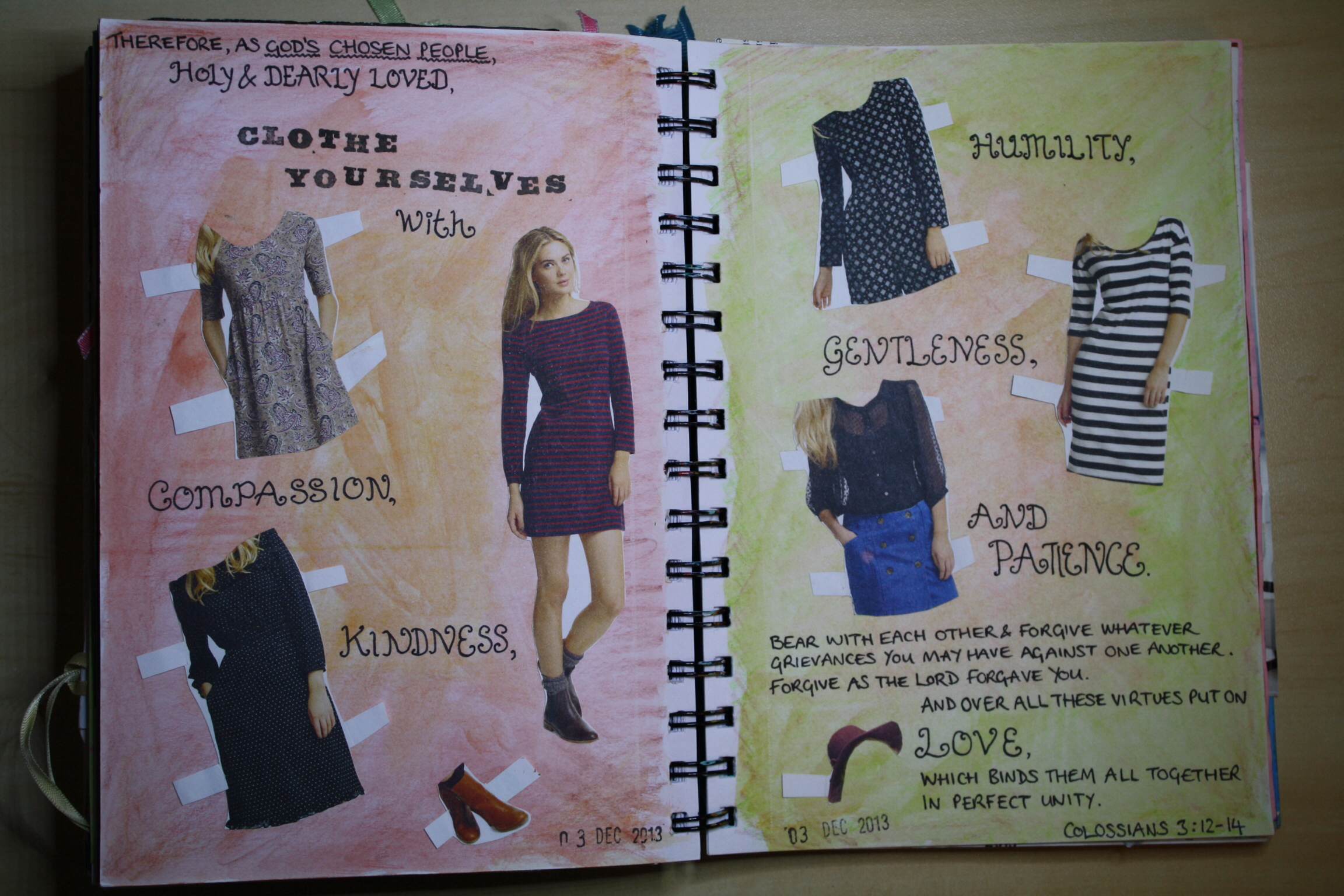 I love these verses in Colossians 3 that tell us to clothe ourselves with compassion, kindness, humility, gentleness, patience and love. I had a lot of fun with these pages, as I was loving the idea of putting on these virtues like an outfit every day. I cut up a clothes catalogue to create this ‘paper doll’ and outfits (inspired by the back page of Bunty circa 1980!)