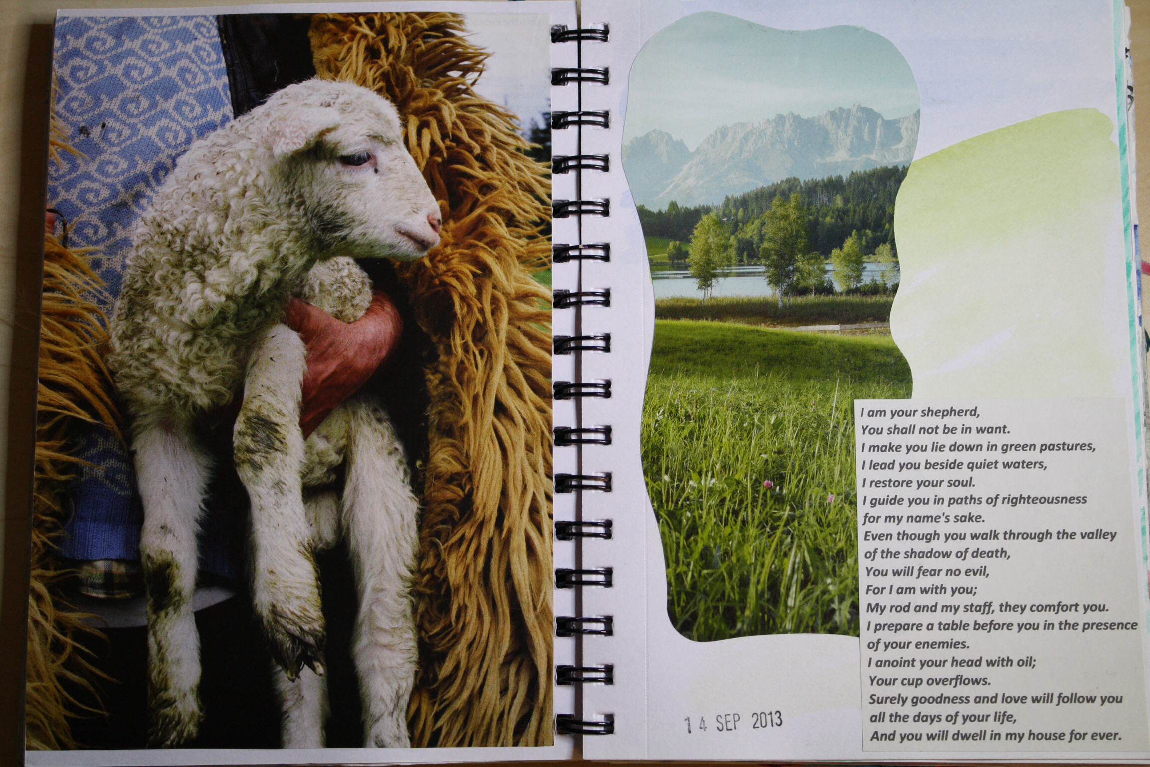 Here I was feeling especially thankful for specific answers to prayers. Used images cut out from magazines, and on the left hand page I included a little hidden pocket behind the picture, with a couple of little prayers of thanks tucked away, just between me and God.