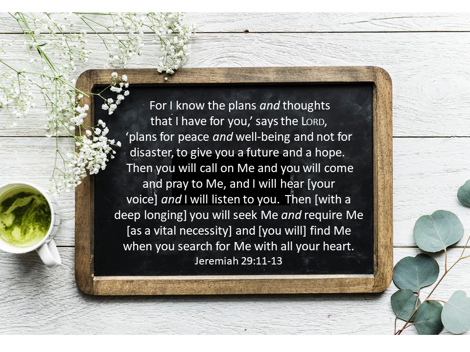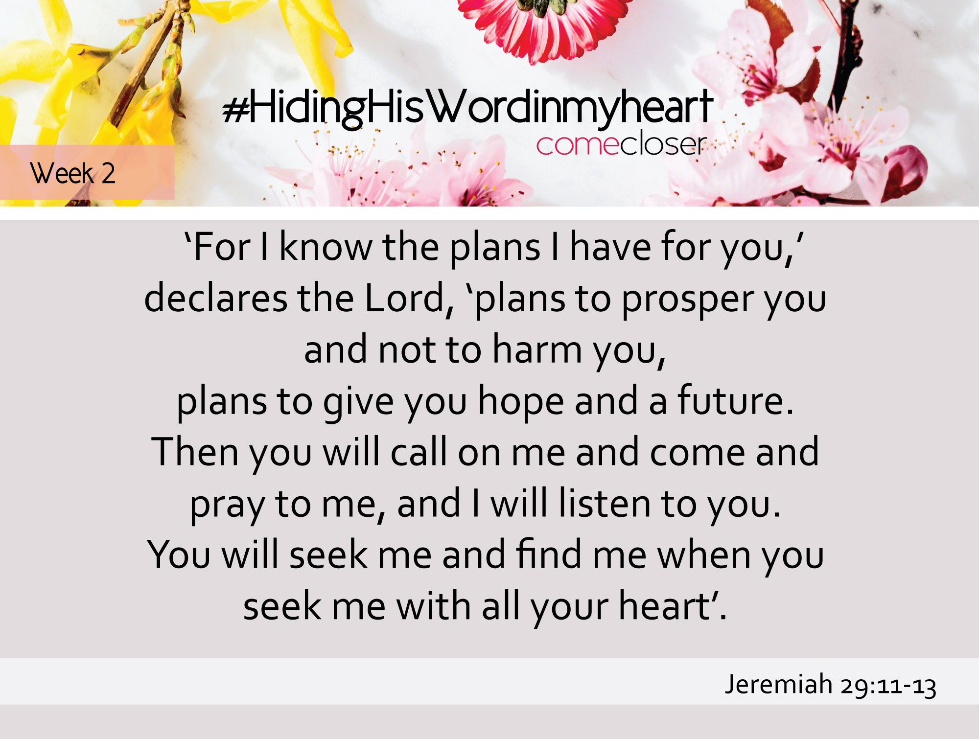 This week’s (week 2) scripture is Jeremiah 29:11-13, which speaks of the plans and purposes God has for your life as you walk with Him and seek Him.